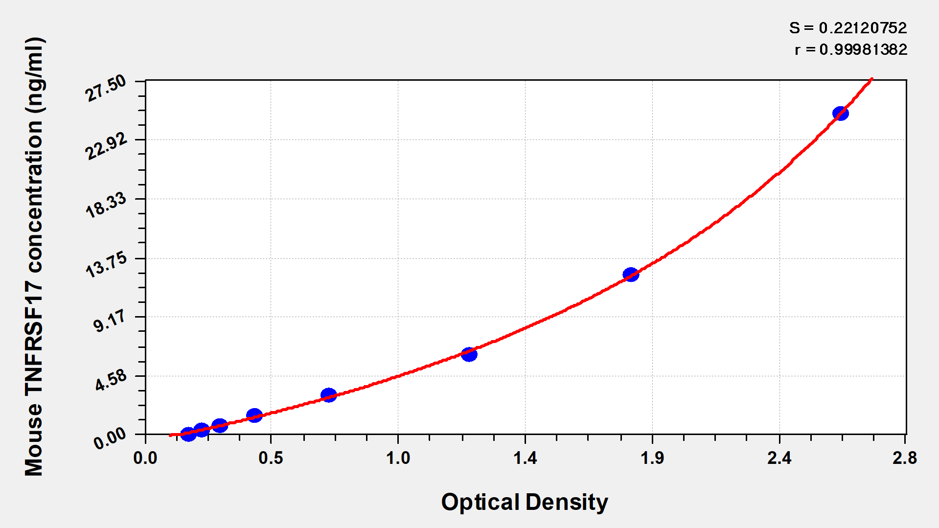 This Mouse TNFRSF17 ELISA Kit was designed for the quantitative measurement of Mouse TNFRSF17 protein in serum, plasma, tissue homogenates. It is a Sandwich ELISA kit, its detection range is 0.39 ng/ml- 20ng/ml and the sensitivity is 0.009 ng/ml.