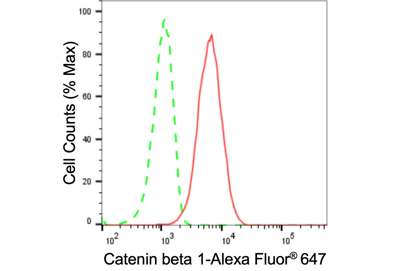 • Flow cytometric analysis of Catenin beta 1 expression in HT-1080 cells using Catenin beta 1 antibody. Green, isotype control; red, Catenin beta 1.