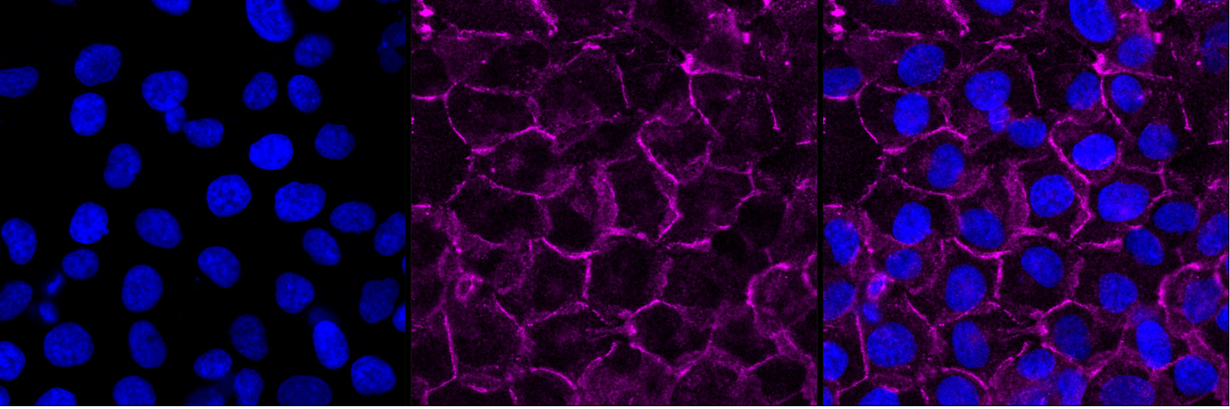 • Immunocytochemical staining of HT-1080 cells with Catenin beta 1 antibody. Nuclei were stained blue with DAPI; Catenin beta 1 was stained magenta with Alexa Fluor® 647. Images were taken using Leica stellaris 5. Protein abundance based on laser Intensity and Smart Gain:Medium. Scale bar, 20 μm.