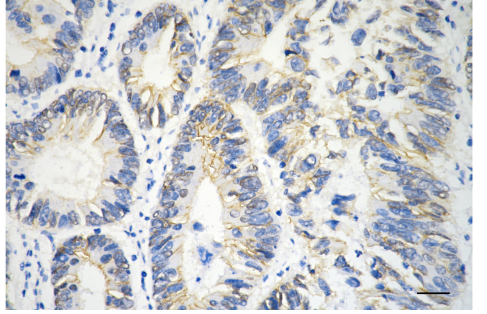 • Immunohistochemistry was performed on paraffin-embedded human sigmoid colon carcinoma using catenin beta 1 antibody. Antigen retrieval was done in sodium citrate buffer (pH 6.0). DAB was used for detection, with hematoxylin counterstaining. Images were acquired using a Nikon Ci-L Plus microscope (40× objective). Scale bar: 25 μm.