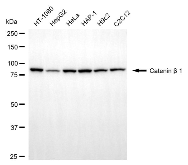 • Western blotting analysis using catenin beta 1 antibody. Total cell lysates (30 μg) from various cell lines were loaded and separated by SDS-PAGE. The blot was incubated with catenin beta 1 antibody and HRP-conjugated goat anti-mouse secondary antibody respectively.
