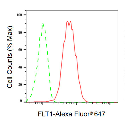 • Flow cytometric analysis of FLT1 expression in HepG2 cells using FLT1 antibody. Green, isotype control; red, FLT1.