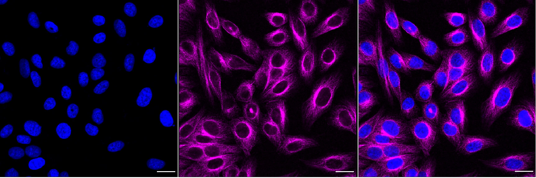 • Immunocytochemical staining of HepG2 cells with FLT1 antibody. Nuclei were stained blue with DAPI; FLT1 was stained magenta with Alexa Fluor® 647. Images were taken using Leica stellaris 5. Protein abundance based on laser Intensity and smart gain: Medium. Scale bar, 20 μm.