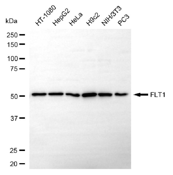 • Western blotting analysis using FLT1 antibody. Total cell lysates (30 μg) from various cell lines were loaded and separated by SDS-PAGE. The blot was incubated with FLT1 antibody and HRP-conjugated goat anti-mouse secondary antibody respectively.