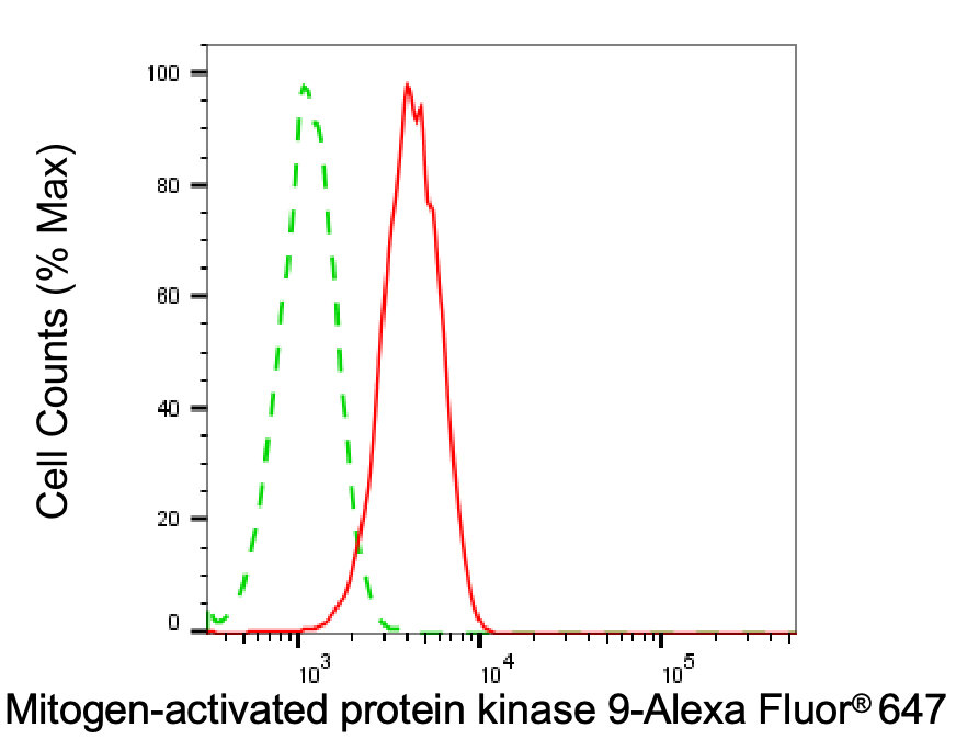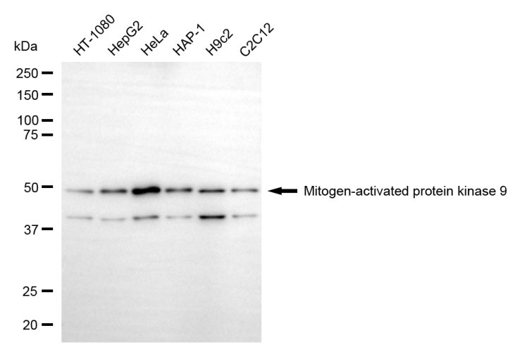 Serine/threonine-protein kinase involved in various processes such as cell proliferation, differentiation, migration, transformation and programmed cell death. Extracellular stimuli such as proinflammatory cytokines or physical stress stimulate the stress-activated protein kinase/c-Jun N-terminal kinase (SAP/JNK) signaling pathway. In this cascade, two dual specificity kinases MAP2K4/MKK4 and MAP2K7/MKK7 phosphorylate and activate MAPK9/JNK2. In turn, MAPK9/JNK2 phosphorylates a number of transcription factors, primarily components of AP-1 such as JUN and ATF2 and thus regulates AP-1 transcriptional activity. In response to oxidative or ribotoxic stresses, inhibits rRNA synthesis by phosphorylating and inactivating the RNA polymerase 1-specific transcription initiation factor RRN3. Promotes stressed cell apoptosis by phosphorylating key regulatory factors including TP53 and YAP1. In T-cells, MAPK8 and MAPK9 are required for polarized differentiation of T-helper cells into Th1 cells. Upon T-cell receptor (TCR) stimulation, is activated by CARMA1, BCL10, MAP2K7 and MAP3K7/TAK1 to regulate JUN protein levels. Plays an important role in the osmotic stress-induced epithelial tight-junctions disruption. When activated, promotes beta-catenin/CTNNB1 degradation and inhibits the canonical Wnt signaling pathway. Participates also in neurite growth in spiral ganglion neurons. Phosphorylates the CLOCK-ARNTL/BMAL1 heterodimer and plays a role in the regulation of the circadian clock. Phosphorylates POU5F1, which results in the inhibition of POU5F1's transcriptional activity and enhances its proteosomal degradation.; MAPK9 isoforms display different binding patterns: alpha-1 and alpha-2 preferentially bind to JUN, whereas beta-1 and beta-2 bind to ATF2. However, there is no correlation between binding and phosphorylation, which is achieved at about the same efficiency by all isoforms. JUNB is not a substrate for JNK2 alpha-2, and JUND binds only weakly to it.