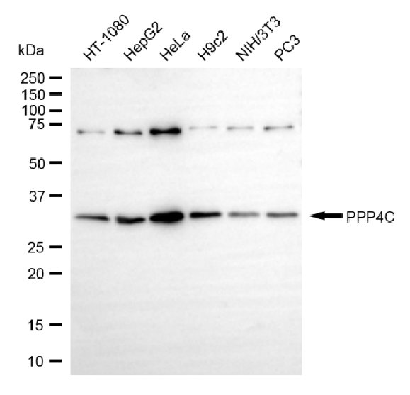 Protein phosphatase that is involved in many processes such as microtubule organization at centrosomes, maturation of spliceosomal snRNPs, apoptosis, DNA repair, tumor necrosis factor (TNF)-alpha signaling, activation of c-Jun N-terminal kinase MAPK8, regulation of histone acetylation, DNA damage checkpoint signaling, NF-kappa-B activation and cell migration. The PPP4C-PPP4R1 PP4 complex may play a role in dephosphorylation and regulation of HDAC3. The PPP4C-PPP4R2-PPP4R3A PP4 complex specifically dephosphorylates H2AX phosphorylated on Ser-140 (gamma-H2AX) generated during DNA replication and required for DNA double strand break repair. Dephosphorylates NDEL1 at CDK1 phosphorylation sites and negatively regulates CDK1 activity in interphase. In response to DNA damage, catalyzes RPA2 dephosphorylation, an essential step for DNA repair since it allows the efficient RPA2-mediated recruitment of RAD51 to chromatin.
