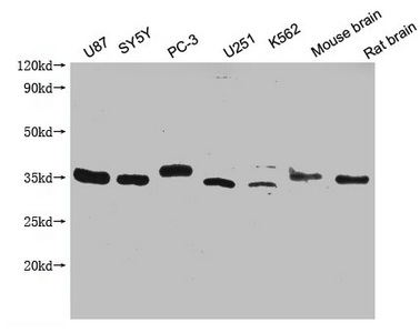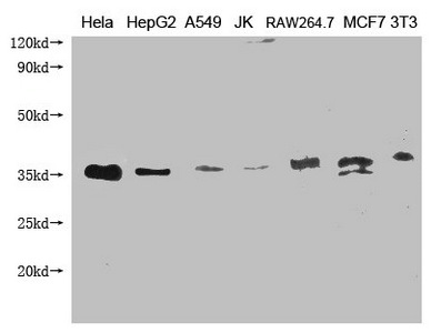 The SDCBP monoclonal antibody is generated by immunizing mice with recombinant human SDCBP protein (2-298aa), isolating B cells from the mouse spleen, and fusing these B cells with myeloma cells to create hybridomas. The hybridoma cells are screened to select the SDCBP antibody-producing cell line, which is cultured in the mouse abdominal cavity. The purified SDCBP monoclonal antibody is obtained from the mouse ascites using protein G affinity chromatography, which ensures a purity of over 95%. It is an unconjugated IgG2b antibody that can recognize three species including human, mouse, and rat, and can be used in ELISA and WB applications.