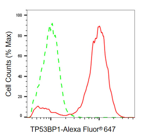 • Flow cytometric analysis of TP53BP1 expression in HAP-1 cells using TP53BP1 antibody. Green, isotype control; red, TP53BP1.