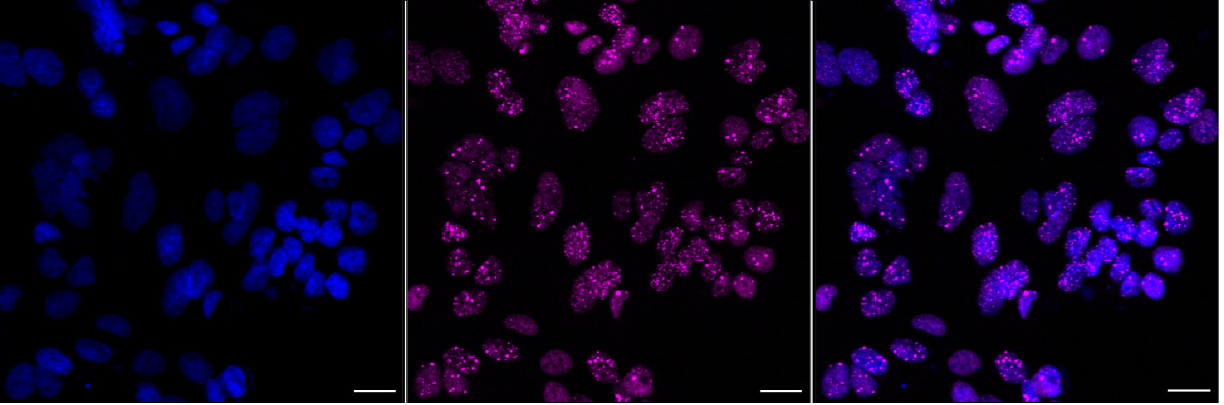 • Immunocytochemical staining of HAP-1 cells with TP53BP1 antibody. Nuclei were stained blue with DAPI; TP53BP1 was stained magenta with Alexa Fluor® 647. Images were taken using Leica stellaris 5. Protein abundance based on laser Intensity and smart gain: Medium. Scale bar, 20 μm.