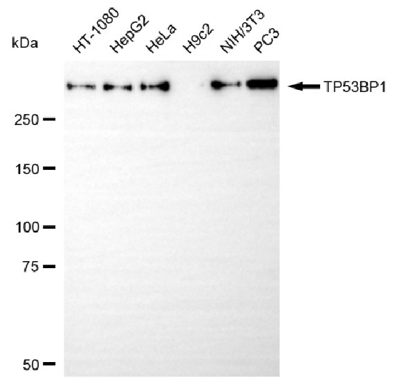 • Western blotting analysis using TP53BP1 antibody. Total cell lysates (30 μg) from various cell lines were loaded and separated by SDS-PAGE. The blot was incubated with TP53BP1 antibody and HRP-conjugated goat anti-mouse secondary antibody respectively.