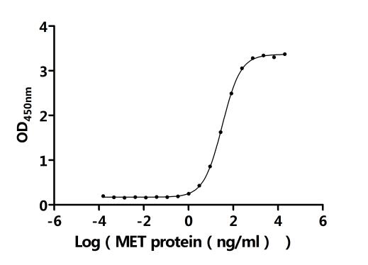 ①Measured by its binding ability in a functional ELISA.Immobilized Anti-MET recombinant antibody (CSB-RA013714MA2HU). at 2 μg/mL can bind Biotinylated Human MET. The EC50 is 30.49-33.61 ng/mL.