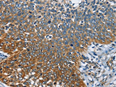 • The image on the left is immunohistochemistry of paraffin-embedded Human cervical cancer tissue using CSB-PA777748(CARD9 Antibody) at dilution 1/60, on the right is treated with fusion protein. (Original magnification: ×200)