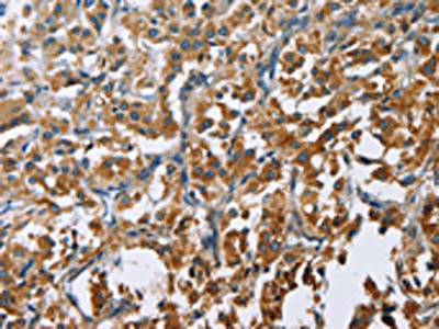 • The image on the left is immunohistochemistry of paraffin-embedded Human thyroid cancer tissue using CSB-PA777748(CARD9 Antibody) at dilution 1/60, on the right is treated with fusion protein. (Original magnification: ×200)