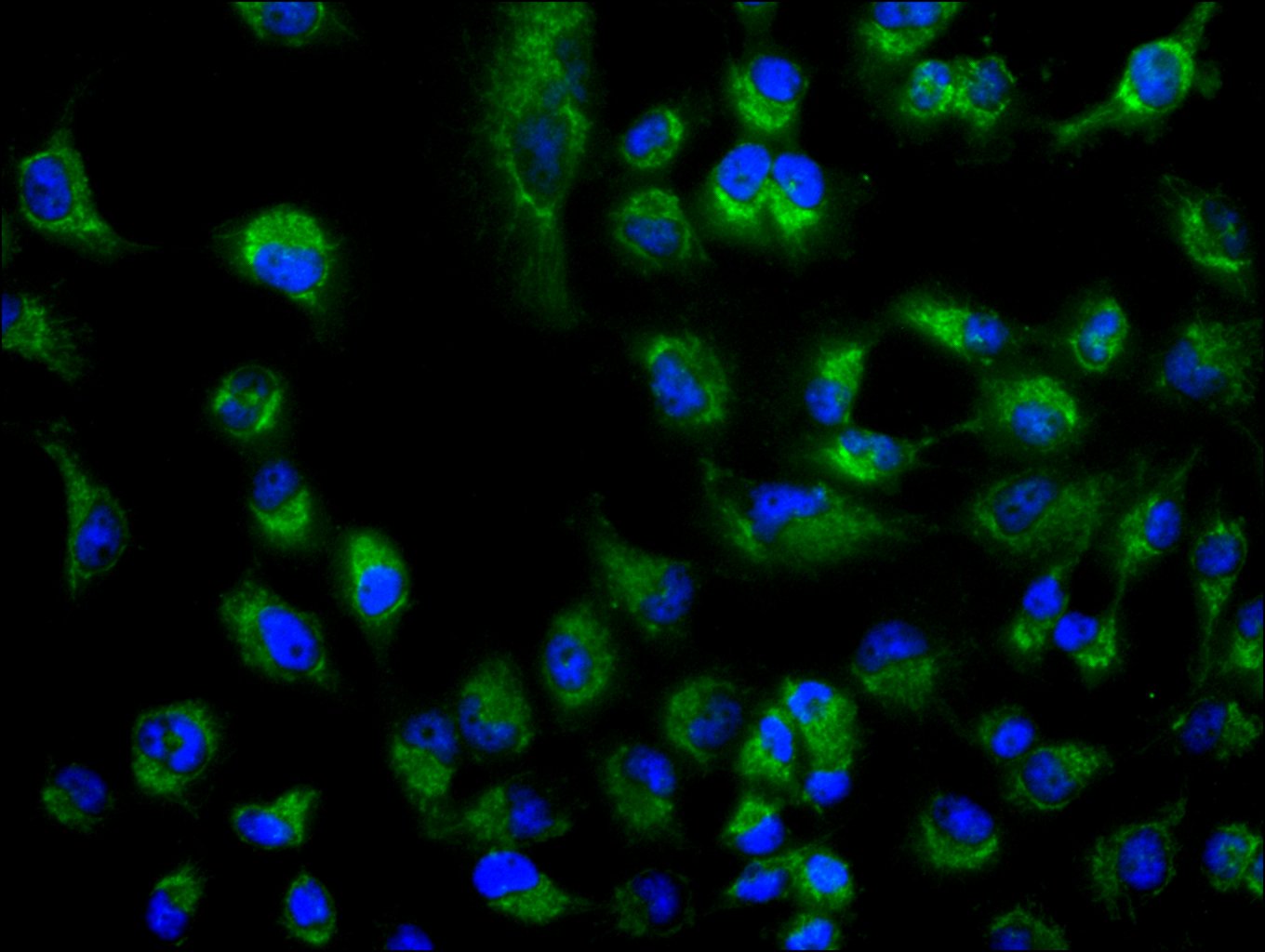 Immunofluorescence staining of U251 cell with CSB-PA757785LA01HU at 1:20, counter-stained with DAPI. The cells were fixed in 4% formaldehyde and blocked in 10% normal Goat Serum. The cells were then incubated with the antibody overnight at 4C. The secondary antibody was Alexa Fluor 488-congugated AffiniPure Goat Anti-Rabbit IgG(H+L).
