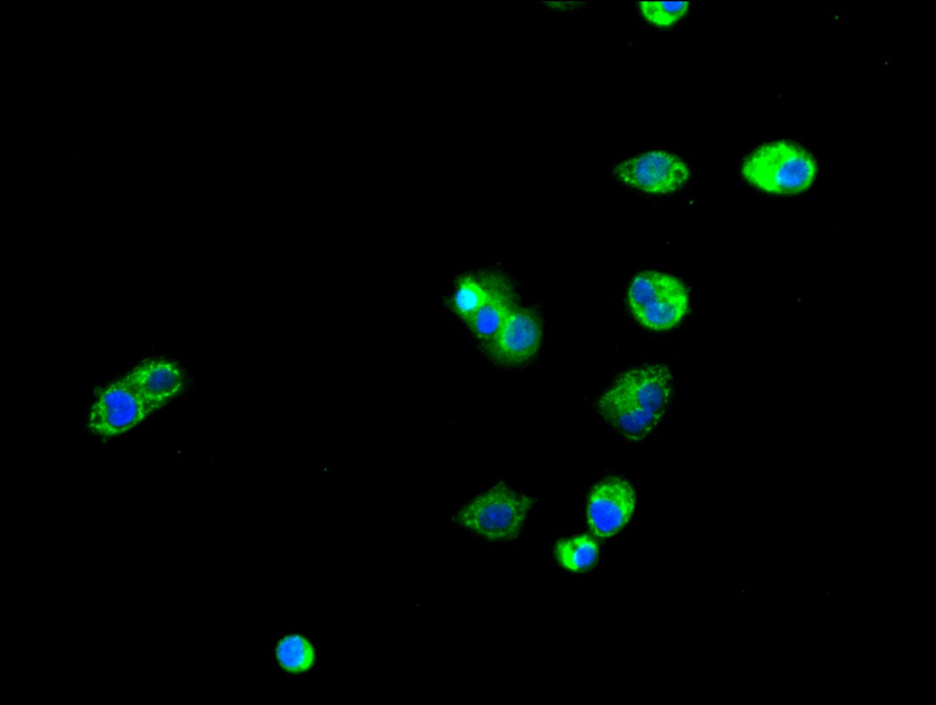 Immunofluorescence staining of HepG2 cell with CSB-PA757785LA01HU at 1:20, counter-stained with DAPI. The cells were fixed in 4% formaldehyde and blocked in 10% normal Goat Serum. The cells were then incubated with the antibody overnight at 4C. The secondary antibody was Alexa Fluor 488-congugated AffiniPure Goat Anti-Rabbit IgG(H+L).