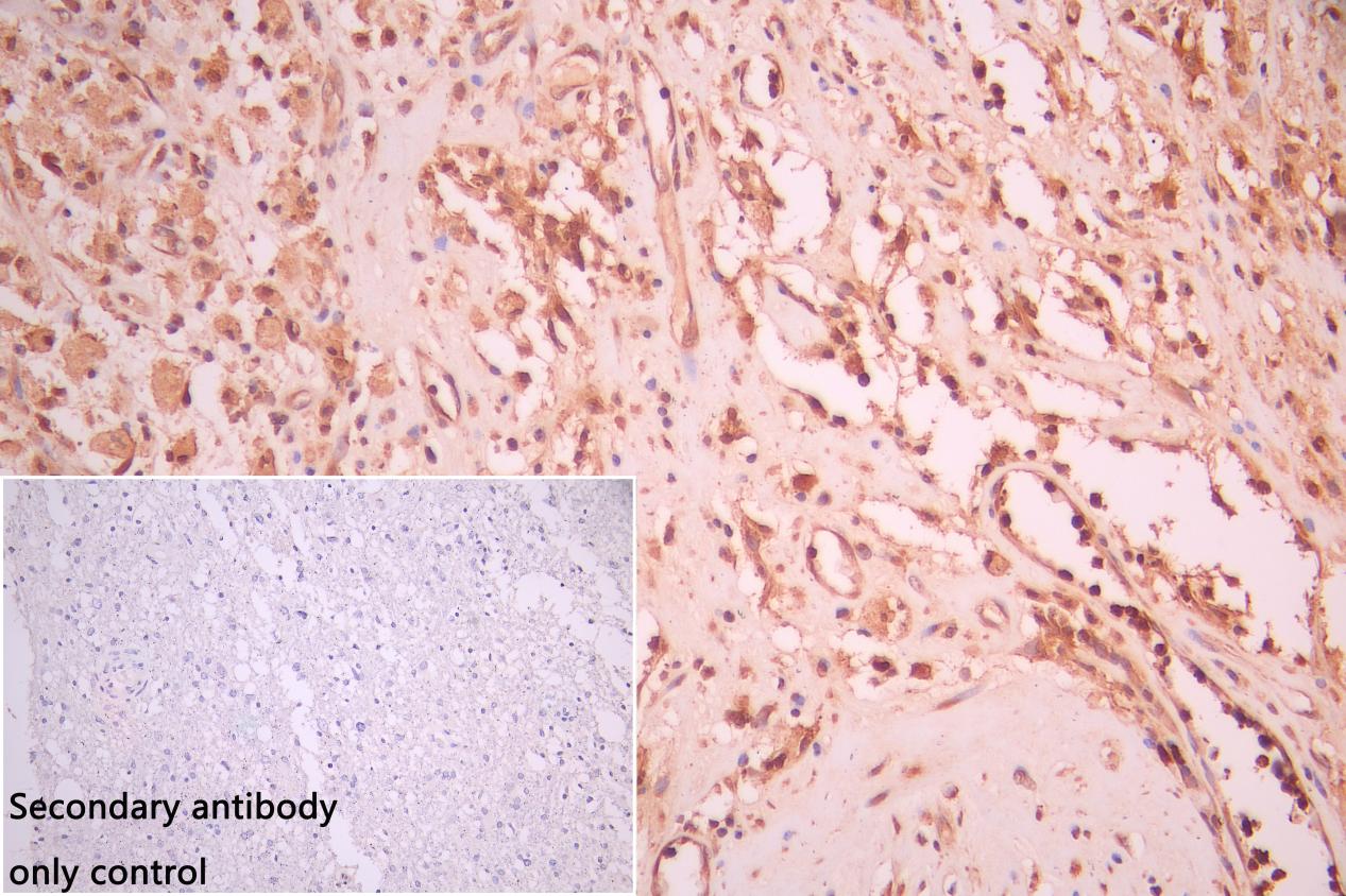 IHC image of CSB-PA757785LA01HU diluted at 1:50 and staining in paraffin-embedded human glioma cancer performed on a Leica BondTM system. After dewaxing and hydration, antigen retrieval was mediated by high pressure in a citrate buffer (pH 6.0). Section was blocked with 10% normal goat serum 30min at RT. Then primary antibody (1% BSA) was incubated at 4°C overnight. The primary is detected by a Goat anti-rabbit polymer IgG labeled by HRP and visualized using 0.05% DAB. Secondary antibody only control: uses 1% BSA instead of primary antibody