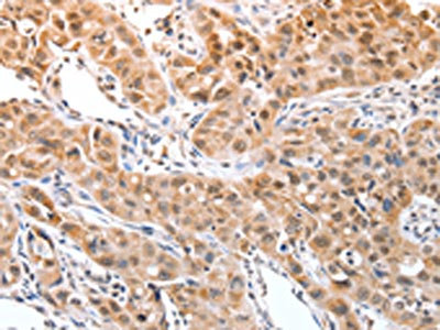 • The image on the left is immunohistochemistry of paraffin-embedded Human lung cancer tissue using CSB-PA992708(DPPA2 Antibody) at dilution 1/30, on the right is treated with fusion protein. (Original magnification: ×200)