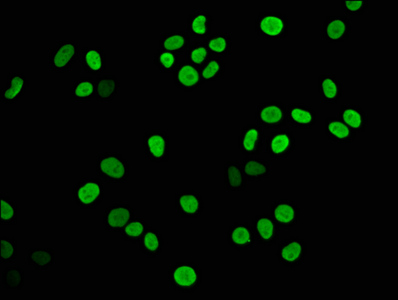 • Immunofluorescence staining of Hela cells with CSB-PA010418OA23ncrHU at 1:1, counter-stained with DAPI. The cells were fixed in 4% formaldehyde, permeabilized using 0.2% Triton X-100 and blocked in 10% normal Goat Serum. The cells were then incubated with the antibody overnight at 4°C. The secondary antibody was Alexa Fluor 488-congugated AffiniPure Goat Anti-Rabbit IgG(H+L).