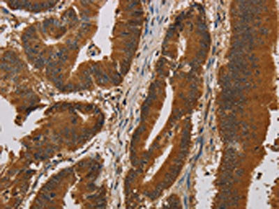 • The image on the left is immunohistochemistry of paraffin-embedded Human colon cancer tissue using CSB-PA139485(IPO9 Antibody) at dilution 1/20, on the right is treated with synthetic peptide. (Original magnification: ×200)