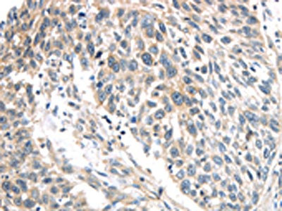 • The image on the left is immunohistochemistry of paraffin-embedded Human lung cancer tissue using CSB-PA142299(IQGAP2 Antibody) at dilution 1/40, on the right is treated with synthetic peptide. (Original magnification: ×200)