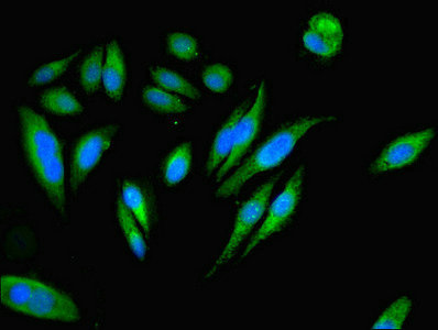 • Immunofluorescent analysis of Hela cells using CSB-PA621865DSR2HU at dilution of 1:100 and Alexa Fluor 488-congugated AffiniPure Goat Anti-Rabbit IgG(H+L)