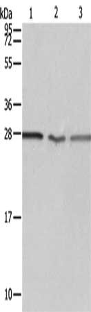 • Gel: 12%SDS-PAGE, Lysate: 40 μg, Lane 1-3: Jurkat cells, A549 cells, Human fetal kidney tissue, Primary antibody: CSB-PA212713(PSMD9 Antibody) at dilution 1/750, Secondary antibody: Goat anti rabbit IgG at 1/8000 dilution, Exposure time: 10 seconds