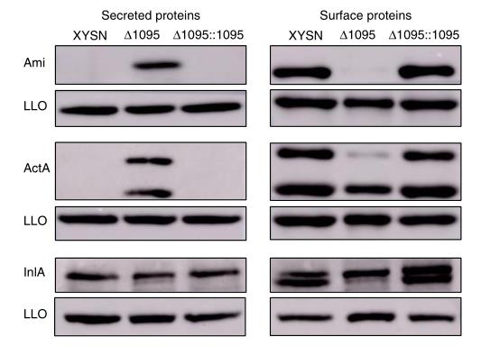 Review: Surface-associated and secreted Lm proteins extracts were obtained from XYSN, Δ1095, and Δ1095::1095. LLO protein levels were used as sample loading control. The image presented is representative of three independent experiments.