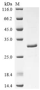 This recombinant Escherichia coli mlaA protein is produced by cloning the gene encoding the full-length mature Escherichia coli probable phospholipid-binding lipoprotein mlaA (18-251aa) and the N-terminal 6xHis-tag gene into a plasmid and transferring the recombinant plasmid into E.coli cells for protein production. The recombinant mlaA protein is isolated and purified from the cell lysate. Its purity is greater than 90% measured by SDS-PAGE. On the gel, the recombinant mlaA protein appears as a band with a molecular weight of approximately 31 kDa.