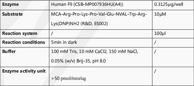Measured by its ability to cleave the fluorogenic peptide substrate, MCA-Arg-Pro-Lys-Pro-Val-Glu-NVAL-Trp-Arg-Lys(DNP)NH2. The specific activity is >50 pmol/min/µg.