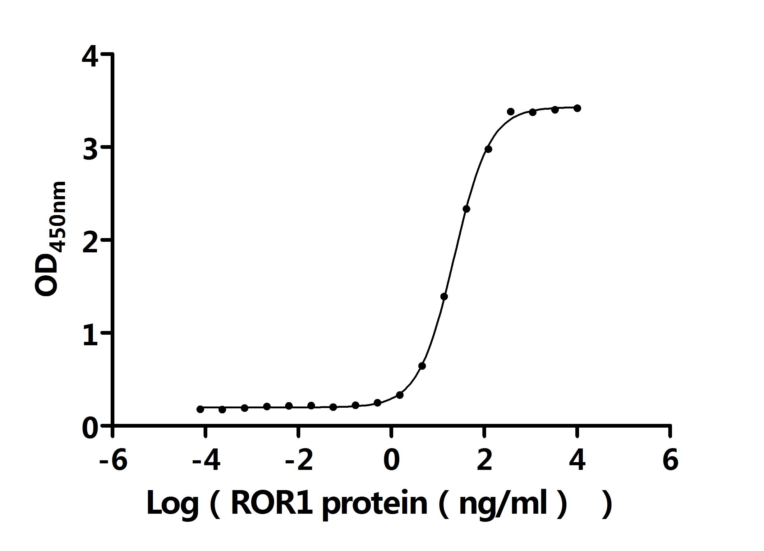 Measured by its binding ability in a functional ELISA.Immobilized Anti-ROR1 recombinant antibody(CSB-RA020067MA2HU) at 2 μg/mL can bind Human ROR1.The EC50 is 21.01-24.28 ng/mL.