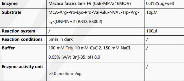 Measured by its ability to cleave the fluorogenic peptide substrate, MCA-Arg-Pro-Lys-Pro-Val-Glu-NVAL-Trp-Arg-Lys(DNP)NH2. The specific activity is >50 pmol/min/µg.