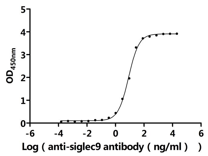 ①Measured by its binding ability in a functional ELISA.Immobilized Macaca fascicularis SIGLEC9 at 2 μg/mL can bind anti-SIGLEC9 recombinant antibody(CSB-RA021303MA2HU).The EC50 is 7.698-8.925 ng/mL.