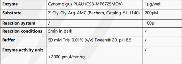Fully active measured by its ability to cleave a peptide substrate, N-carbobenzyloxy-Gly-Gly-Arg-7-amido-4-methylcoumarin (Z-GGR-AMC). PLAU needs to be activated by Plasmin to be enzymatically active. The specific activity is > 2000 pmol/min/ug.