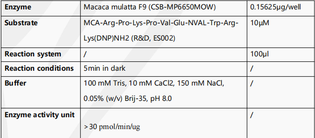 Measured by its ability to cleave the fluorogenic peptide substrate, MCA-Arg-Pro-Lys-Pro-Val-Glu-NVAL-Trp-Arg-Lys(DNP)NH2. The specific activity is >30 pmol/min/µg.