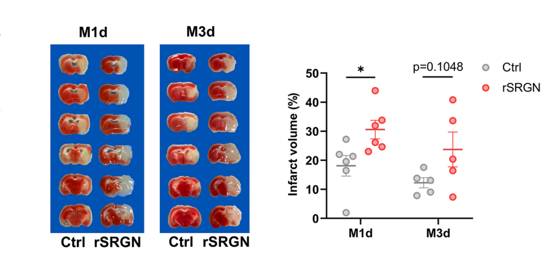 Review: We added exogenous recombinant SRGN to observe the infuence of SRGN overload on microglial activation in vitro and in vivo, while we utilized gene knockout mice to eliminate SRGN.As a result, exogenous injection of rSRGN led to an enlarged infarct volume than solvent controls (Fig. 2B, C).