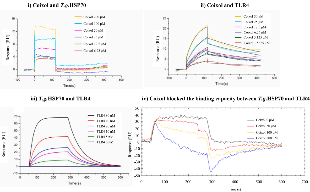 Review: Binding affinities of coixol for T.g.HSP70 and TLR4. Coixol directly interacts with T.g.HSP70 in a dose-dependent manner by LSPR.