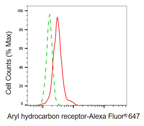 • Flow cytometric analysis of aryl hydrocarbon receptor expression in HepG2 cells using aryl hydrocarbon receptor antibody. Green, isotype control; red, aryl hydrocarbon receptor.