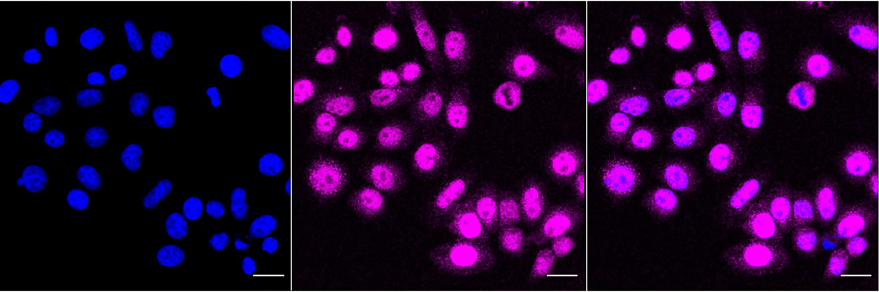 • Immunocytochemical staining of HepG2 cells with Aryl hydrocarbon receptor antibody. Nuclei were stained blue with DAPI; Aryl hydrocarbon receptor was stained magenta with Alexa Fluor® 647. Images were taken using Leica stellaris 5. Protein abundance based on laser Intensity and smart gain: Medium. Scale bar, 20 μm.