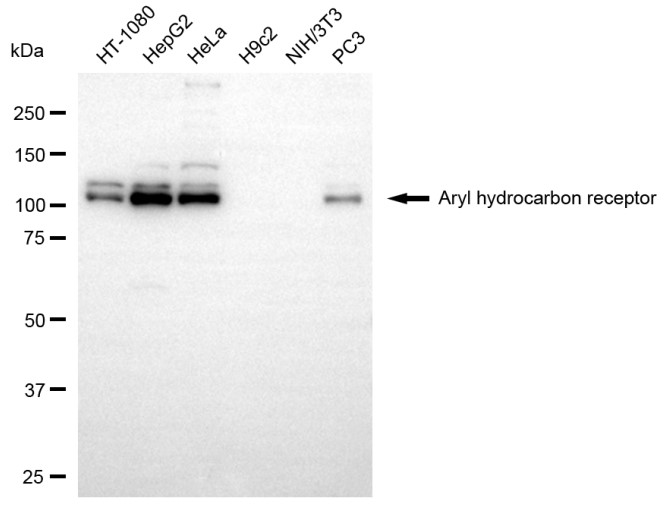 • Western blotting analysis using aryl hydrocarbon receptor antibody. Total cell lysates (30 μg) from various cell lines were loaded and separated by SDS-PAGE. The blot was incubated with aryl hydrocarbon receptor antibody and HRP-conjugated goat anti-rabbit secondary antibody respectively.