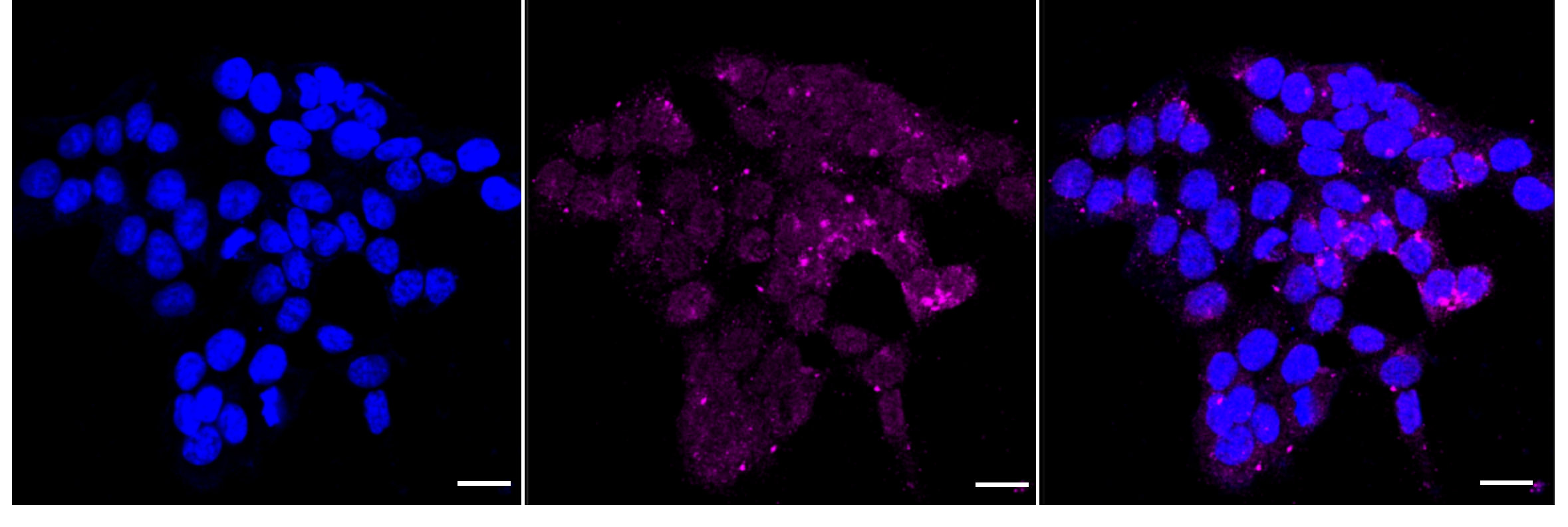 • Immunocytochemical staining of HAP-1 cells with apolipoprotein E antibody. Nuclei were stained blue with DAPI; Apolipoprotein E was stained magenta with Alexa Fluor® 647. Images were taken using Leica stellaris 5. Protein abundance based on laser Intensity and smart gain: Medium. Scale bar: 20 μm.