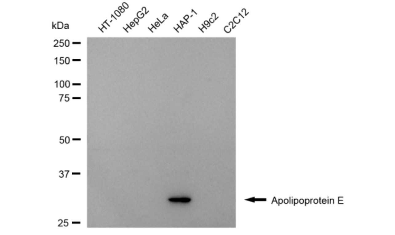 • Western blotting analysis using Apolipoprotein E antibody. Total cell lysates (30 μg) from various cell lines were loaded and separated by SDS-PAGE. The blot was incubated with Apolipoprotein E antibody and HRP-conjugated goat anti-rabbit secondary antibody respectively.