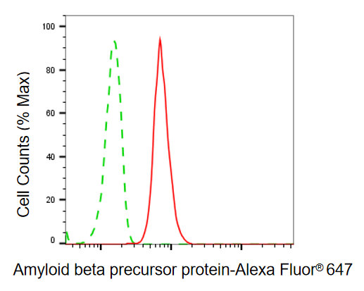 • Flow cytometric analysis of amyloid beta precursor protein expression in HT-1080 cells using amyloid beta precursor protein antibody. Green, isotype control; red, amyloid beta precursor protein.