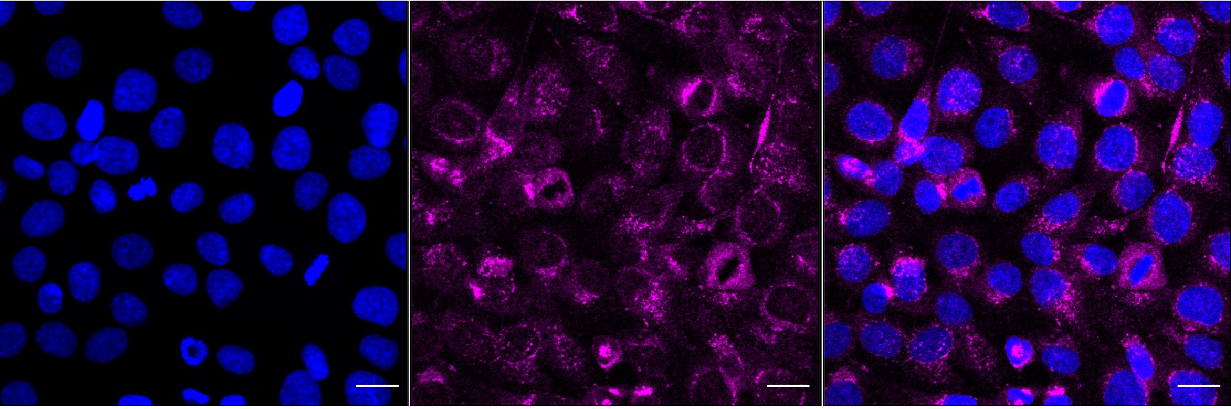 • Immunocytochemical staining of HT-1080 cells with Amyloid beta precursor protein antibody. Nuclei were stained blue with DAPI; Amyloid beta precursor protein was stained magenta with Alexa Fluor® 647. Images were taken using Leica stellaris 5. Protein abundance based on laser Intensity and smart gain: Medium. Scale bar, 20 μm.