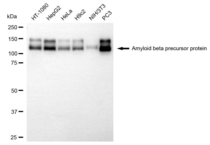 • Western blotting analysis using amyloid beta precursor protein antibody. Total cell lysates (30 μg) from various cell lines were loaded and separated by SDS-PAGE. The blot was incubated with amyloid beta precursor protein antibody and HRP-conjugated goat anti-rabbit secondary antibody respectively.