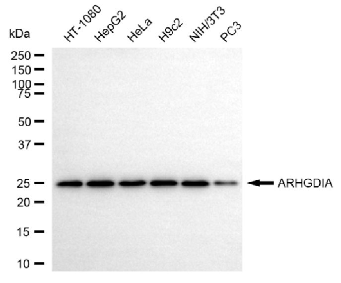 • Western blotting analysis using ARHGDIA antibody. Total cell lysates (30 μg) from various cell lines were loaded and separated by SDS-PAGE. The blot was incubated with ARHGDIA antibody and HRP-conjugated goat anti-mouse secondary antibody respectively.