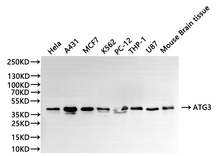 2610016C12Rik antibody; Apg 3 antibody; APG3 antibody; APG3 autophagy 3 like antibody; APG3 like antibody; APG3, S. cerevisiae, homolog of antibody; APG3-like antibody; APG3L antibody; Apg3p antibody; ATG 3 antibody; ATG3 antibody; ATG3 autophagy related 3 homolog antibody; ATG3 autophagy related 3 homolog (S. cerevisiae) antibody; ATG3_HUMAN antibody; Autophagy 3, S. cerevisiae, homolog of antibody; Autophagy Apg3p/Aut1p like antibody; autophagy related 3 antibody; Autophagy related protein 3 antibody; Autophagy-related protein 3 antibody; DKFZp564M1178 antibody; FLJ22125 antibody; hApg3 antibody; MGC15201 antibody; OTTHUMP00000214547 antibody; OTTHUMP00000214548 antibody; PC3 96 antibody; Protein PC3-96 antibody; Ubiquitin-like-conjugating enzyme ATG3 antibody