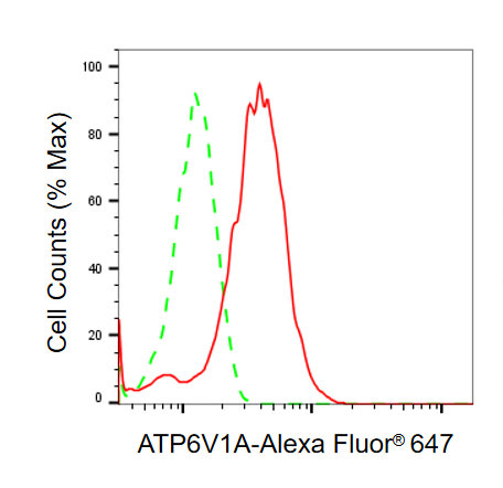 • Flow cytometric analysis of ATP6V1A expression in HepG2 cells using ATP6V1A antibody. Green, isotype control; red, ATP6V1A.
