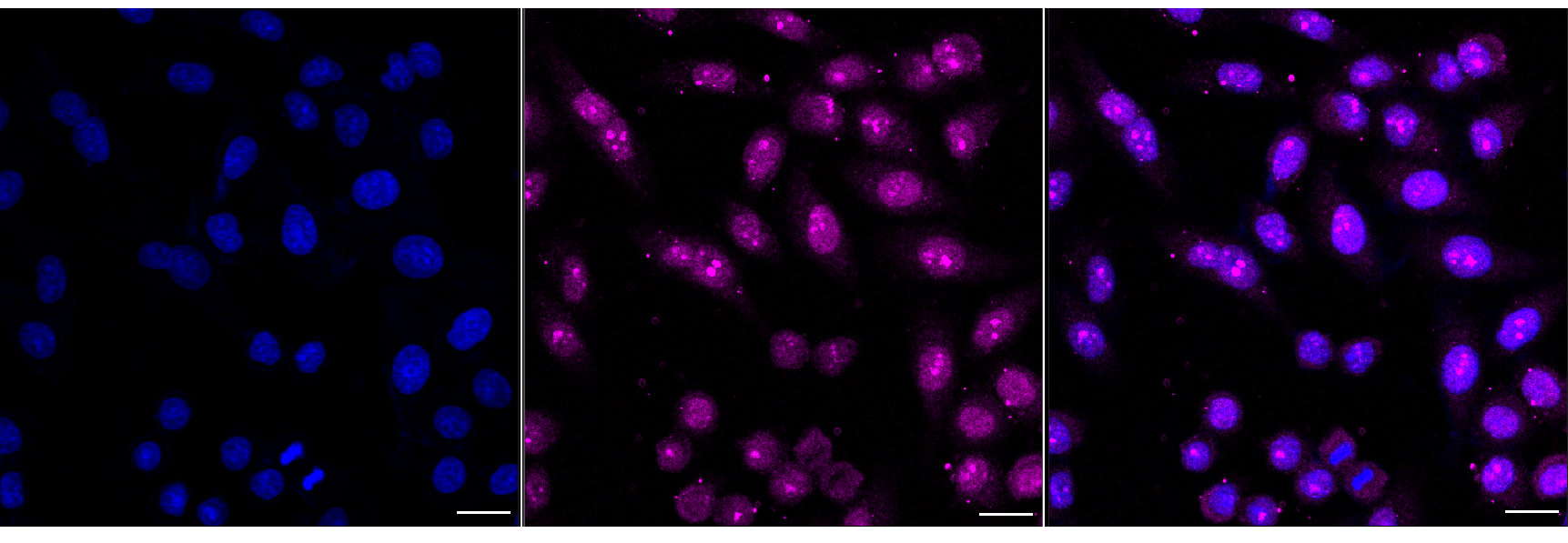 • Immunocytochemical staining of HepG2 cells with ATP6V1A antibody. Nuclei were stained blue with DAPI; ATP6V1A was stained magenta with Alexa Fluor® 647. Images were taken using Leica stellaris 5. Protein abundance based on laser Intensity and smart gain: Medium. Scale bar, 20 μm.