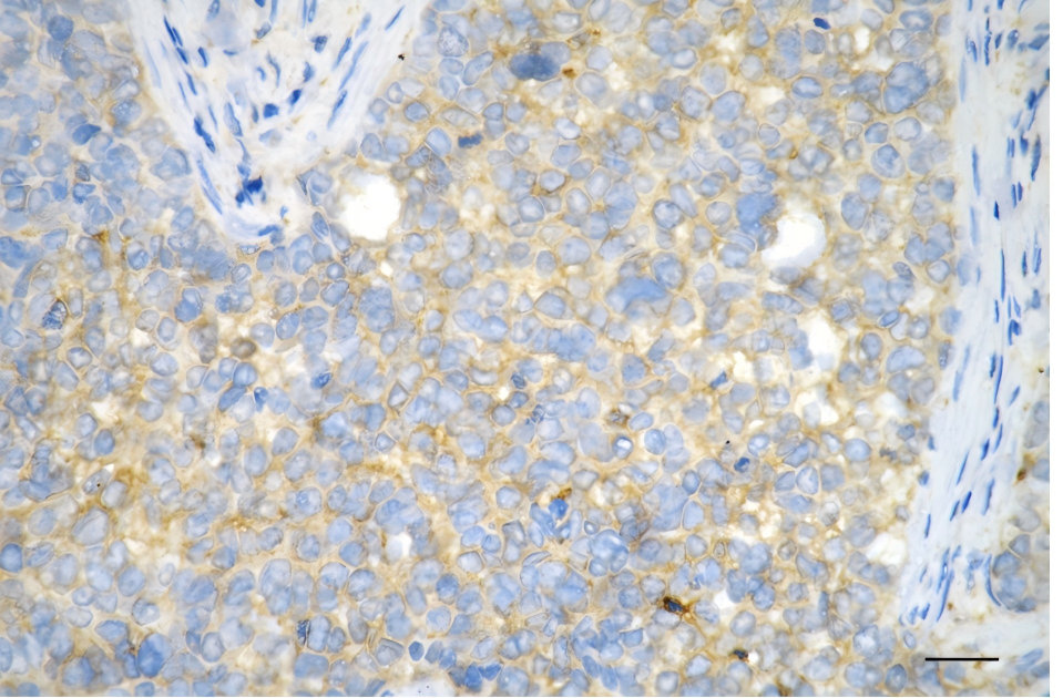 • Immunohistochemistry was performed on paraffin-embedded human breast carcinoma using ATP6V1A antibody. Antigen retrieval was done in sodium citrate buffer (pH 6.0). DAB was used for detection, with hematoxylin counterstaining. Images were acquired using a Nikon Ci-L Plus microscope (40× objective). Scale bar: 25 μm.