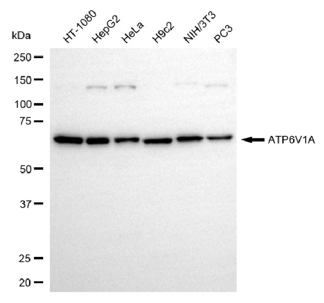 • Western blotting analysis using ATP6V1A antibody. Total cell lysates (30 μg) from various cell lines were loaded and separated by SDS-PAGE. The blot was incubated with ATP6V1A antibody and HRP-conjugated goat anti-rabbit secondary antibody respectively.